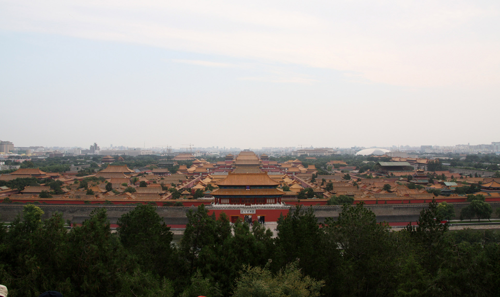 The forbidden city. View from a small hill nearby. All the red roof tops belong to the forbidden city.. It clarifies somehow, why the name is not "forbidden palace"... Note: The hill was made by the digging of the moat around the city..