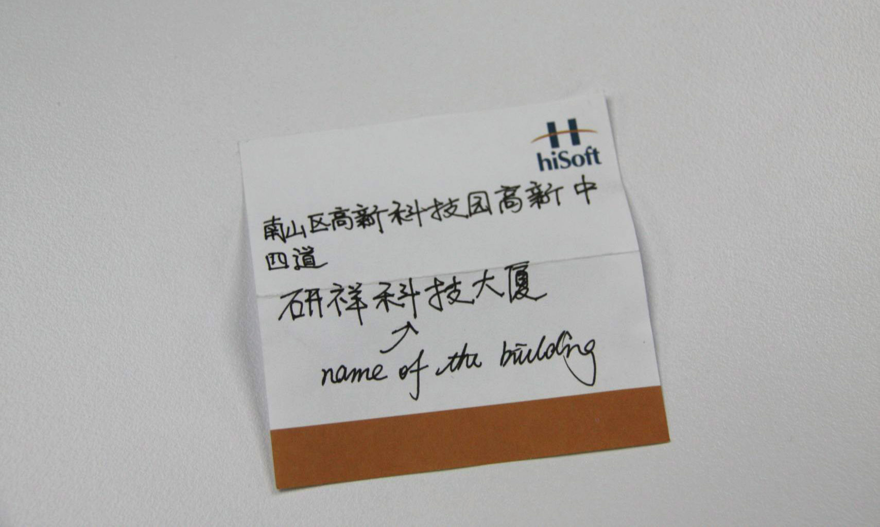 Shenzhen: My survival note: The address of the HiSoft office written in chines letter. There is no way to get to the office, since no taxi driver neither speaks english nor understands our letters...
