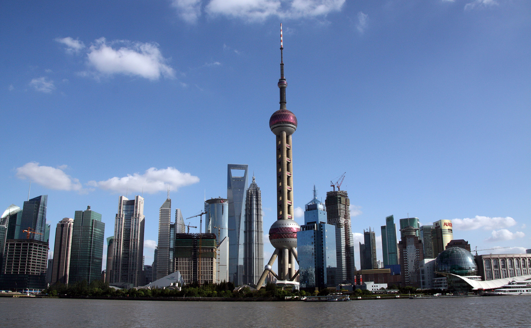 Pudong: The skyline with the futuristic Oriental Pearl TV tower (468 meters high). In the back the building that looks like a shopping bag is the WTC (World Financial Center) with 492 meters hight, even bigger...